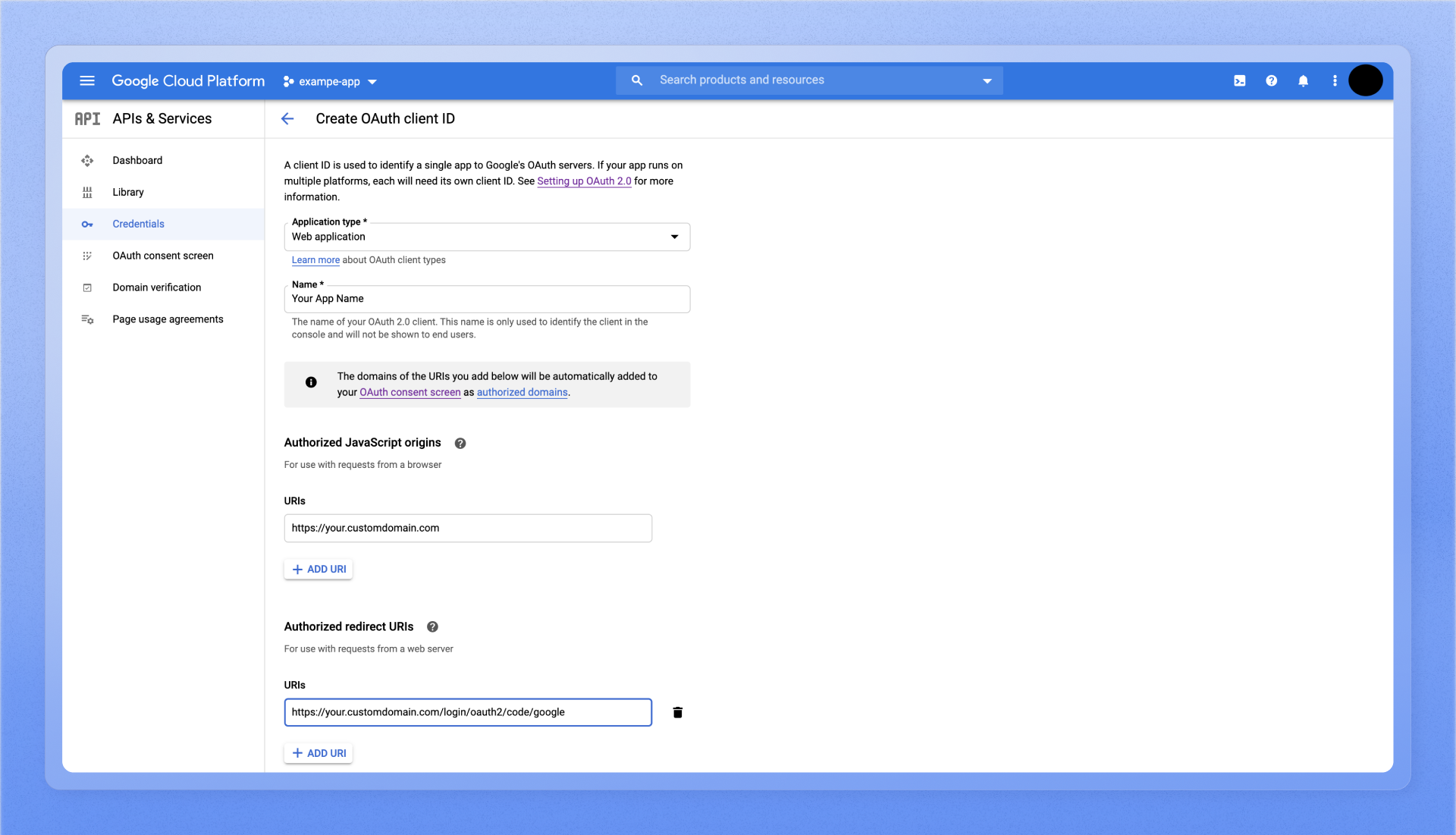 Append the path that users should be redirected to after they have authenticated with Google.https://<plane.example.com>/auth/google/callbackandhttps://<plane.example.com>/auth/mobile/google/callback/where<plane.example.com>is your self-hosted instance's domain. - Click Create.